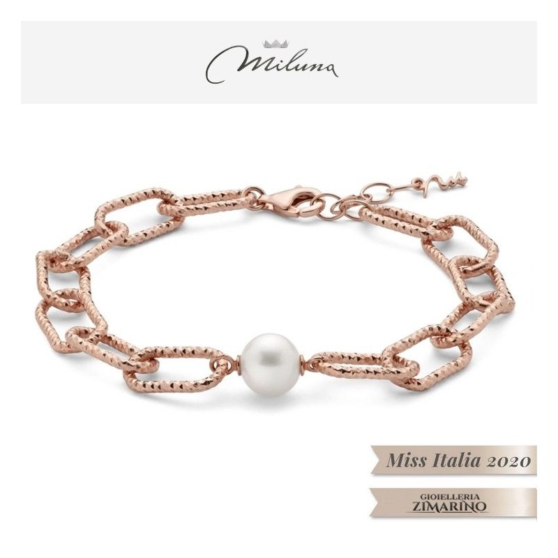 Bracciale collezione Miss Italia maglia a catena rosè da 16 mm con speciale lavorazione diamantata in argento 925 e con perla coltivata bianca ø 9-9,5.