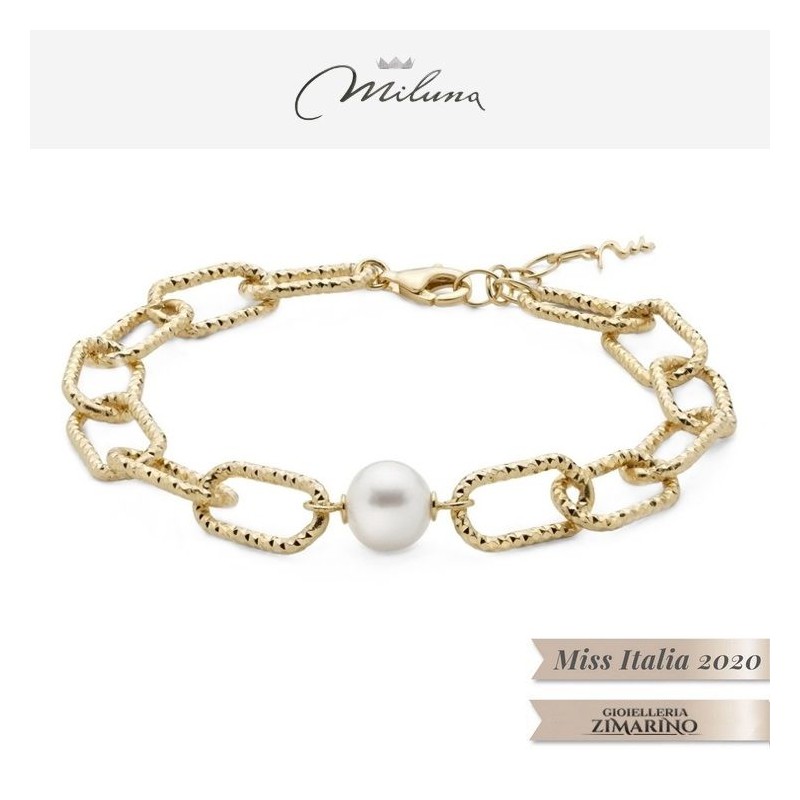 Bracciale collezione Miss Italia maglia a catena gialla da 16 mm con speciale lavorazione diamantata in argento 925 e con perla coltivata bianca ø 9-9,5.