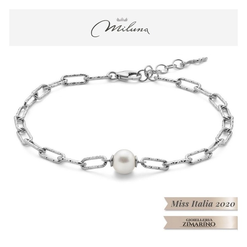 Bracciale maglia a catena da 9 mm con speciale lavorazione diamantata in argento 925 e con perla coltivata bianca ø 7-7,5. Lunghezza bracciale da 17,5 cm fino a 19,5 cm grazie all'uso degli anellini di allungo presenti nell'estremità vicino alla chiusura con esclusivo monogramma Miluna.