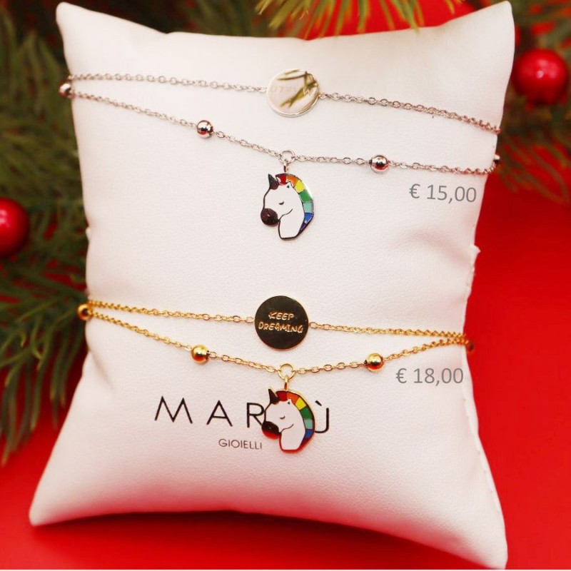 • Marlù gioielli: bracciale con doppia catena in acciaio, la prima catena è una cross chain, al centro ha un pendente con inciso "KEEP DREAMING ", la seconda catena è una cross chain con sfere di 3 mm, con al centro un pendente a forma di unicorno con smalti colorati. Bracciale regolabile da 19 a 15 cm.